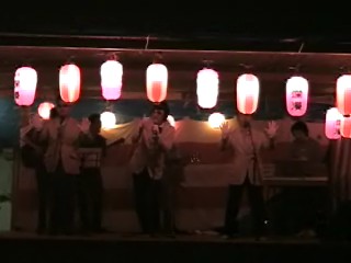 夜の演芸会ではお囃子披露や子ども会の合唱、老人会の尺八演奏、保存会の歌とダンスで